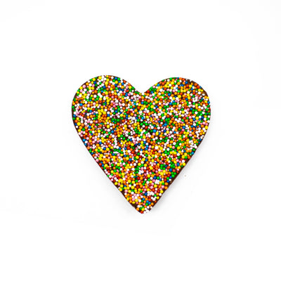 Balanced couverture milk chocolate shaped into a classic heart and topped with bright crunchy freckles.