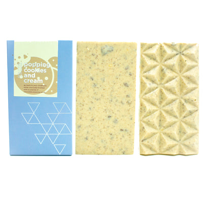 Go back to your childhood. Milky white chocolate mixed with crumbly chocolate cookie and finished with a surprise of vanilla popping candy.